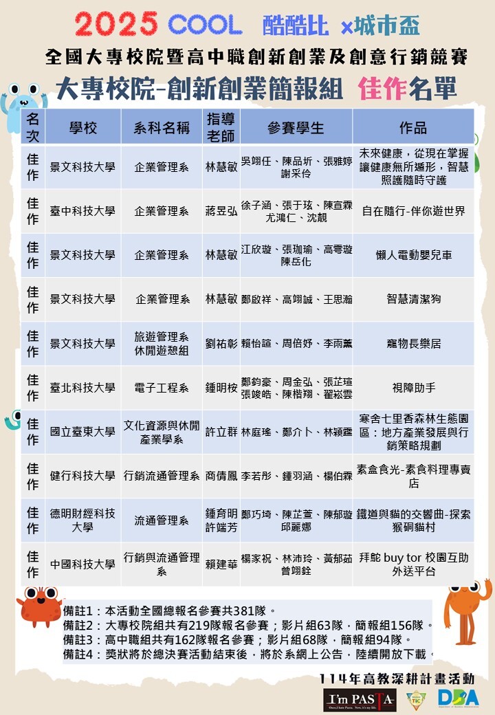 2025 COOL酷酷比 《大專組》創新創業簡報組-佳作名單