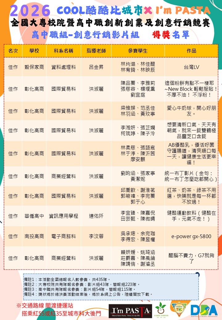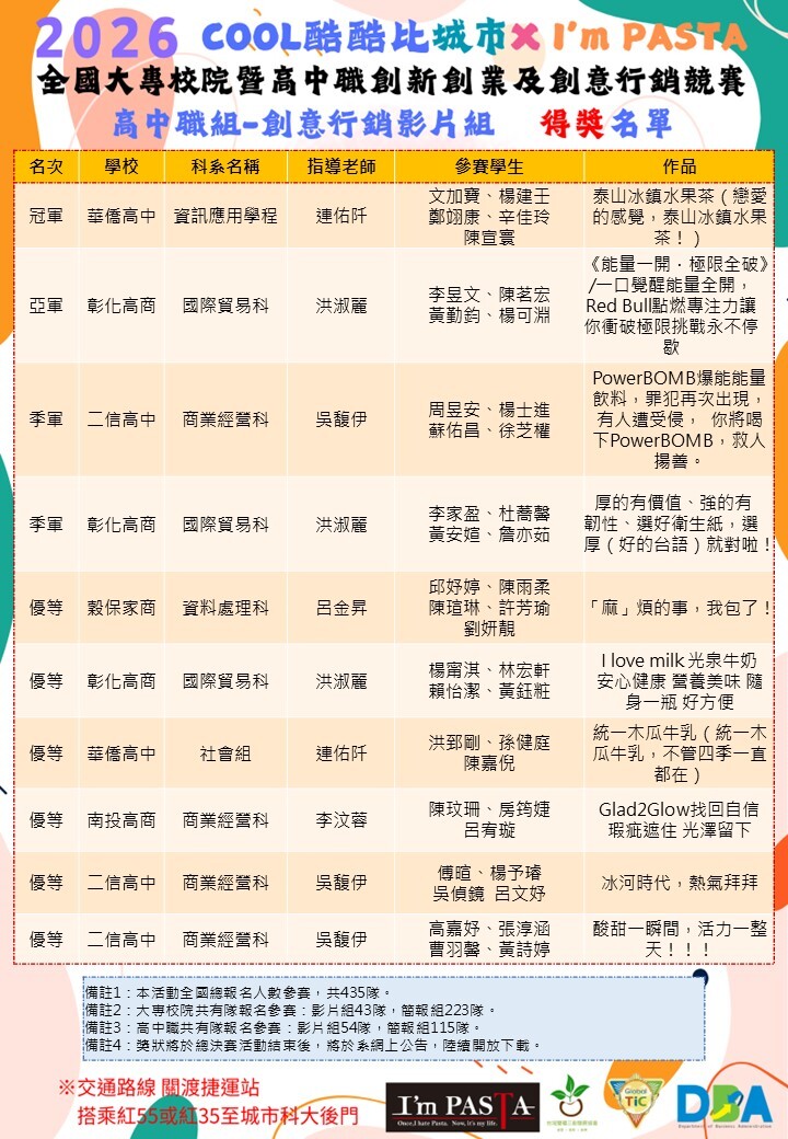 2026 COOL酷酷比 《高中職組》創意行銷影片組-得獎&佳作名單