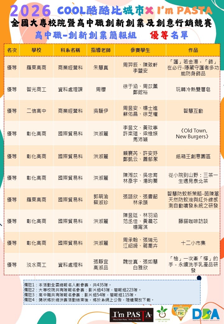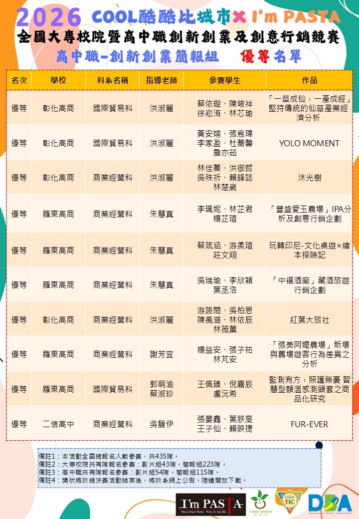 2026 COOL酷酷比 《高中職組》創新創業簡報組-優等名單